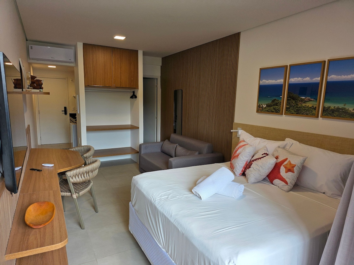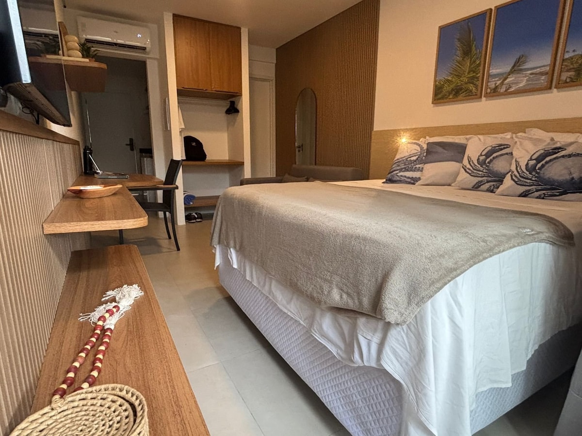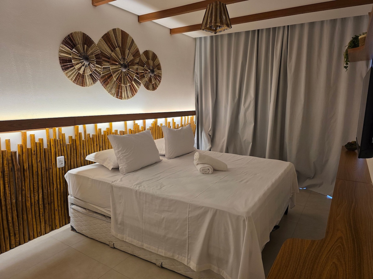 Boka din reträtt i Itacaré! I en fristad där solen tar farväl vid horisonten och vågorna viskar gamla berättelser, presenterar vi vår charmiga studio, strategiskt belägen nära den livliga gatan i byn, känd som Pituba. Tropisk miljö: När du korsar tröskeln möts du av en rymlig studio, en perfekt fusion av modernitet och tropisk sommar. Med en inbjudande dubbelsäng och en bäddsoffa är detta en plats där komfort flätas samman med stil.