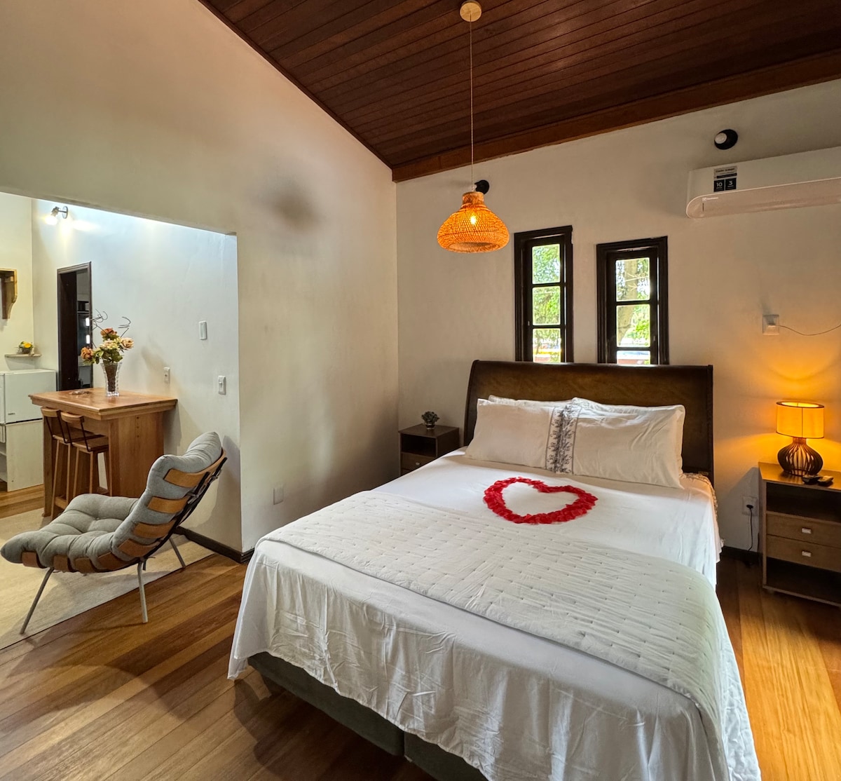 Här har varje detalj skapats för att ge komfort, avskildhet och en oemotståndlig romantisk atmosfär. Uteplatsen är den stora höjdpunkten: mysig belysning, charmig inredning och en mysig bubbelpool med bungalow och ljus — den perfekta miljön för ett oförglömligt ögonblick.