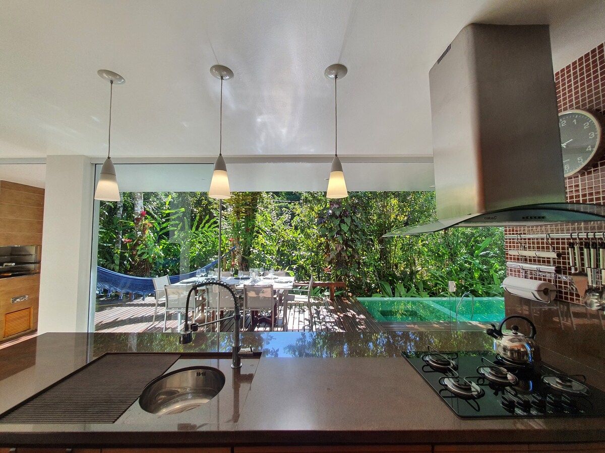 Vårt hus är ett projekt av Carlos Lemos, och är ett stort och superupplyst enplanshus. Beläget på en tomt med privilegierad utsikt över havet och bergen. Det är omgivet av den atlantiska skogen, med få grannar, cirka 500 meter från stranden. Huset är fullt utrustat med ett komplett kök och tvättstuga, och har snabbt internet (100Mb) med wi-fi i alla rum. Vardagsrummet har en öppen spis och balkongen är ganska stor med en altan, hängmattor och en bärbar grill.