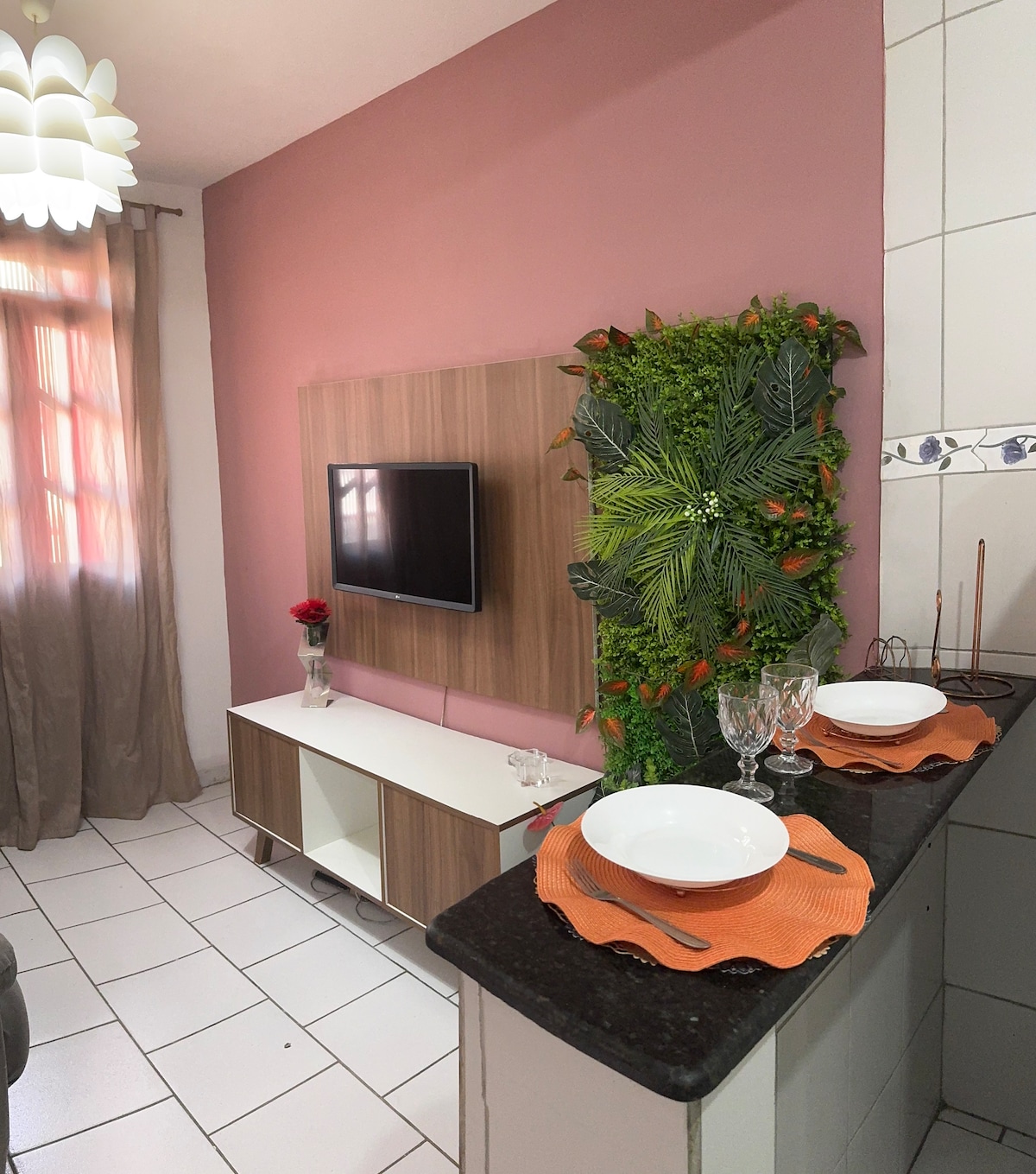 Apartamento completo com sala, quarto e cozinha num só ambiente Fica na parte térrea de uma casa localizada no andar superior. A área externa é compartilhada com os hóspedes da casa que, muitas vezes somos nós, os anfitriões. O quarto pode ser arrumado para casal ou 2 camas de solteiro. Não tem TV. Não aceitamos pet.