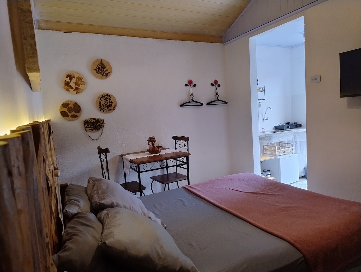 Få kontakt med dem du älskar mest på denna idealiska plats för dem som söker lugn och ro med en charmig utsikt över ⛰️ naturens berg som gör vårt utrymme ännu mer fantastiskt. Vi har utmärkt fiberoptiskt Internet för arbete hemifrån, en grillplats, hela huset är inhägnat så att du kan låta ditt husdjur ströva fritt, mineralvatten i kranarna, en handfatskran, en kokvrå, varmvatten, TV med Oi TV-kanaler. Vi är 15 minuter från Binah-klostret, 22 km från Monte Verde.