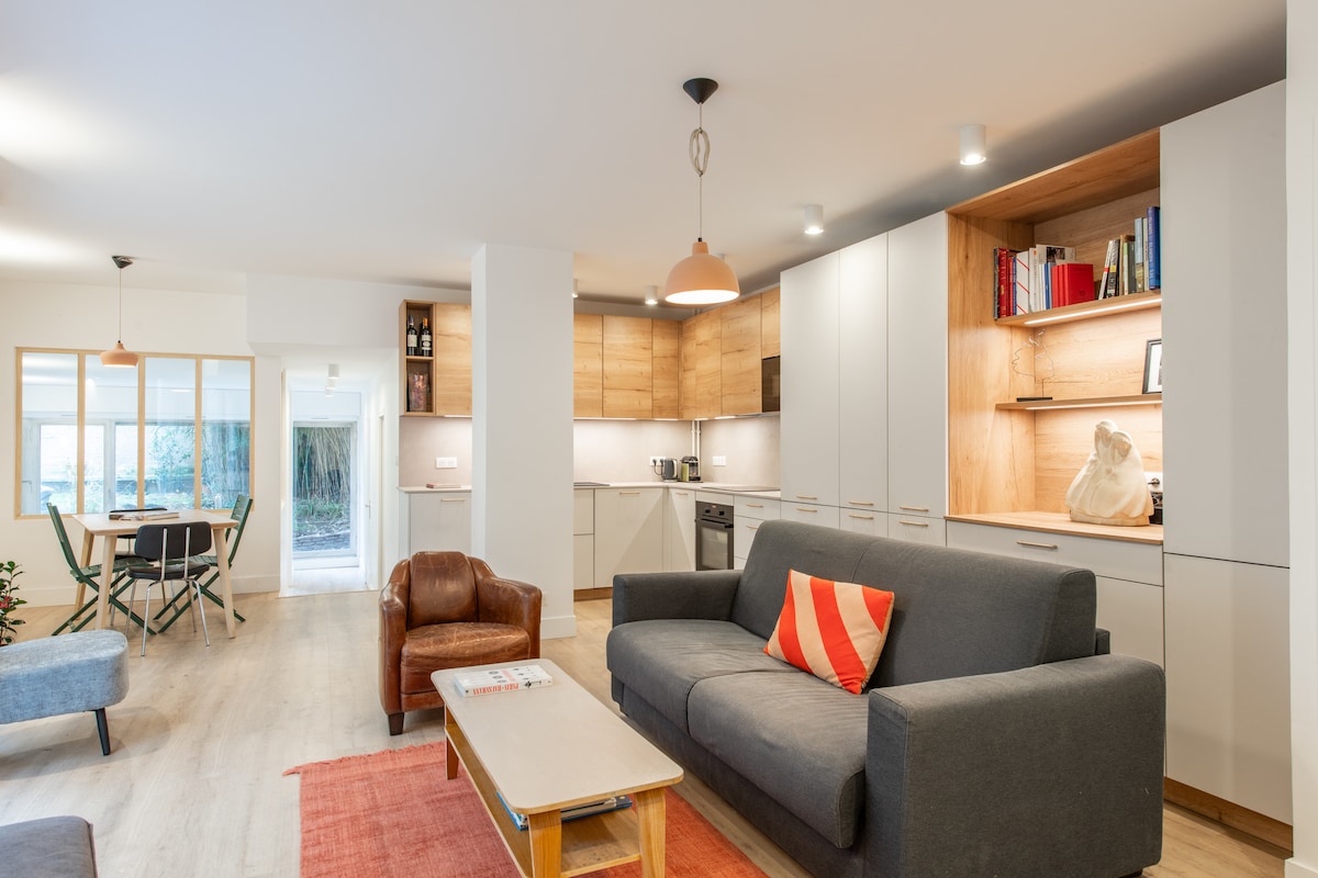Upptäck ett charmigt radhus i en lugn delning med säker parkering, mycket sällsynt 500 m från Paris! - 4 sovrum - 3 badrum inklusive 2 toaletter - 1 stort vardagsrum, matsal och öppet kök - 1 uteplats och lummig trädgård - 1 säker parkeringsplats Paris 13:e arrondissement 10 minuter till fots, kollektivtrafik 5 minuter bort (tunnelbana, spårvagn, buss). Sänglinne ingår. Kaffe, toalettpapper, rengöringsprodukter tillhandahålls.