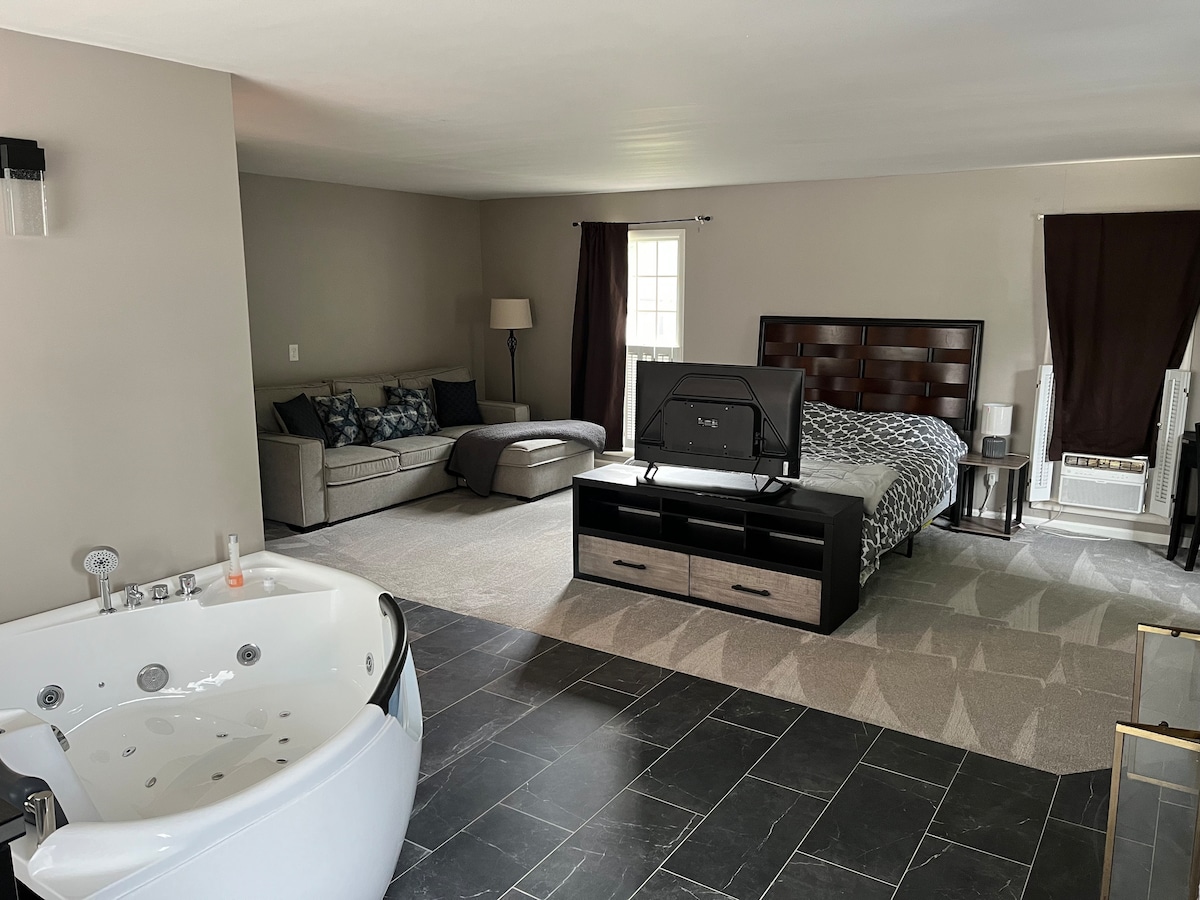 Omge dig med stil i denna enastående svit!! Denna rymliga jacuzzisvit har en jacuzzi i rummet mittemot en vacker öppen spis för den ultimata romantiska resan. Detta helt nya utrymme har en dubbelsäng, utfällbar soffa, smart tv, pentry med minikylskåp, mikrovågsugn och en keurig. Koppla av i din privata jacuzzi eller den delade bubbelpoolen och poolen strax utanför din enhet som delas med en annan bnb inom fastigheten. Du har ditt eget privata utrymme och ingång!!