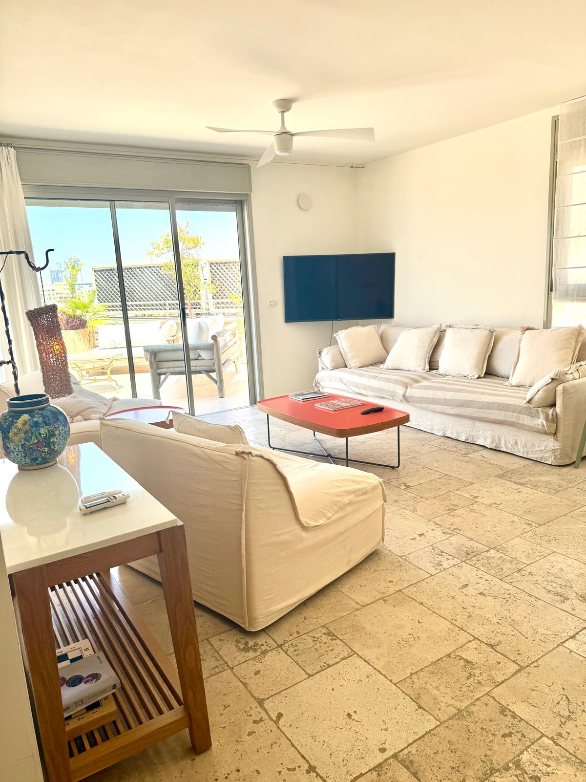 Välkommen till vår fantastiska renoverade takvåning inbäddad i hjärtat av TLV, bara några ögonblick från den skimrande stranden. Denna lägenhet har översta våningen i en noggrant bevarad Bauhaus-byggnad och erbjuder en oslagbar blandning av historisk charm och modern. en värld av sofistikerad elegans så snart du öppnar dörren. Den högljudda inredningen i denna takvåning hyllar Bauhaus-stilen, den rymliga, öppna layouten skapar en inbjudande atmosfär, perfekt för avkoppling eller underhållning