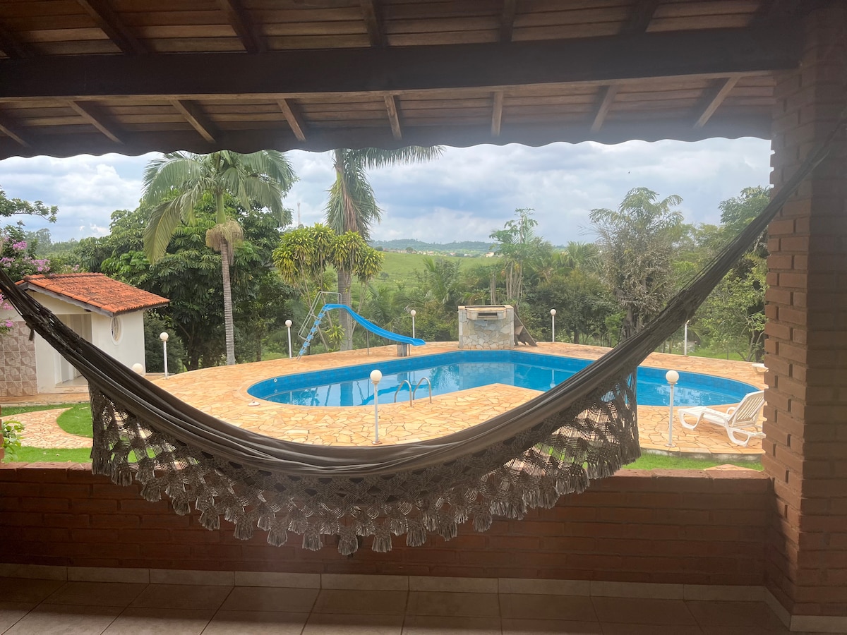 Det är en 7 000 m² stor gård integrerad i naturen med utsikt över ett av vattenfallen i Jaguari-floden, perfekt för vila på helger och helgdagar. Hus med öppen planlösning, gourmetutrymme, två pooler, en med bar och fotbollsplan. Boende för 12 personer, 10 personer i de 3 sovrummen och 2 personer i bäddsoffan i vardagsrummet. Det finns 3 badrum, ett inne i huset och 2 utanför huset. Gästerna får tillgång till kastruller, skålar, tallrikar, vattenglas, muggar, bestick etc.