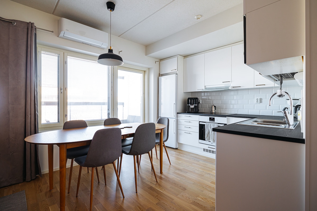 Njut av en hemtrevlig vistelse i en kompakt 45 m² lägenhet på andra våningen i centrala Seinäjoki. Det är bara 500 meter till järnvägsstationen och den närmaste matbutiken ligger 350 meter bort. Sängkläder och handdukar väntar alltid på dig och ingår i hyran. Det finns sovplatser för sex personer: dubbelsäng, bäddsoffa och en bred luftmadrass. Lägenheten har en kylmaskin och mörkläggningsgardiner i sovrummet. Dessutom har du tillgång till en gratis parkeringsplats för en bil.