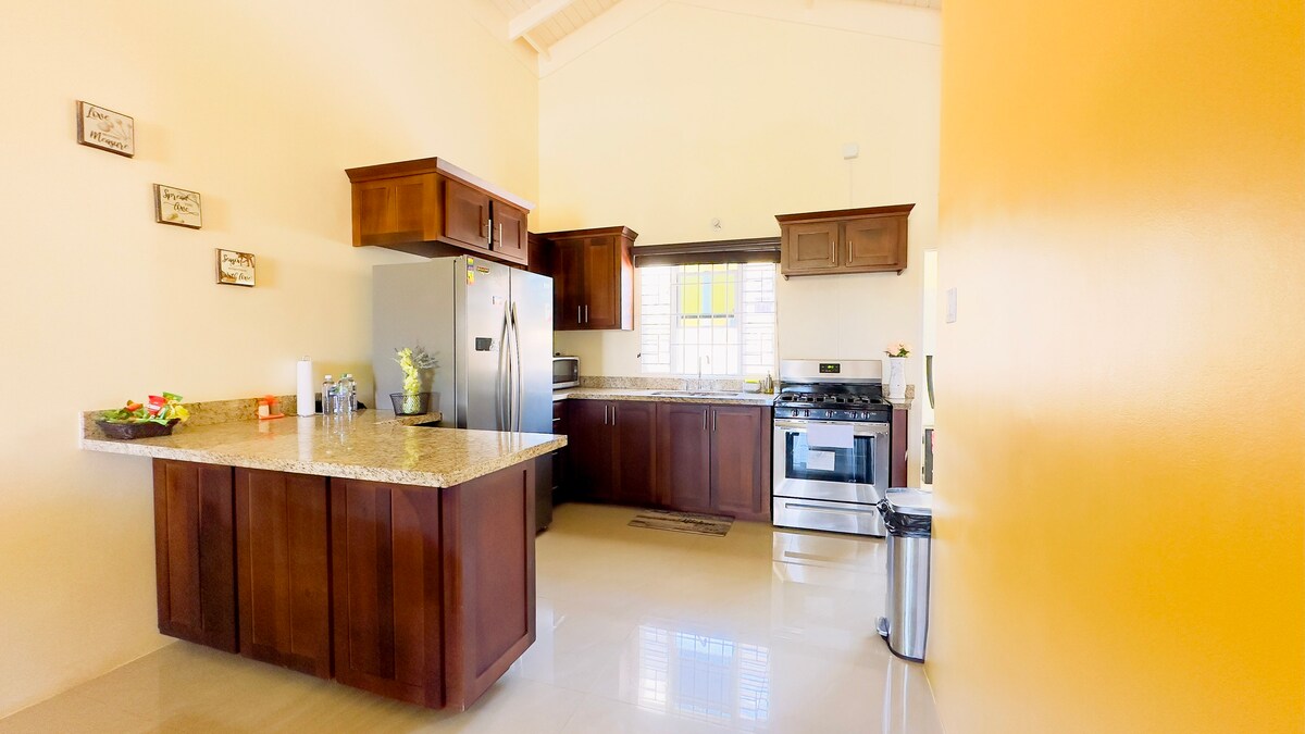 Glöm alla vardagliga bekymmer i detta rymliga och fridfulla boende. Fem (5 minuter från stranden för total avkoppling. Ta dina saftiga jamaicanska patties i stan och glöm inte din jerk chicken och jerk pork på baksidan. Sväng i komfort och njut av sval bris på dina telefoner eller läs en bok under överflödet av jamaicanska fruktträd. Klipp din favoritros i den frodiga trädgården. 15 minuter från Ian Flemmings Int'l flygplats och 35 minuter från de berömda Dunns River Falls.