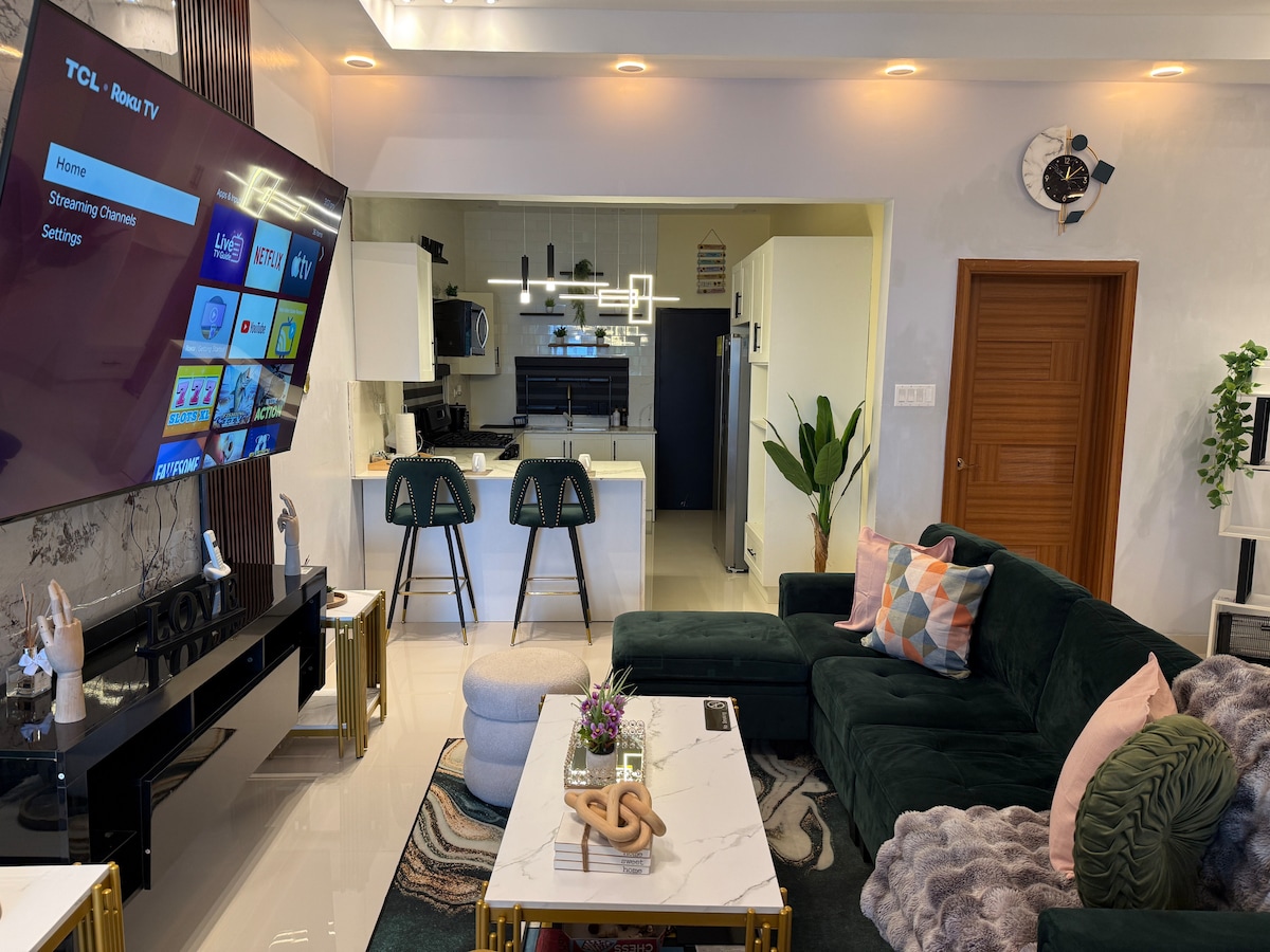 Njut av en elegant upplevelse på detta centralt belägna ställe. Njut av elegans i denna eleganta 2BR-svit i hjärtat av Kingston, bara några steg från Devon House. Med moderna ytor, luftkonditionering, höghastighets-Wi-Fi och en privat balkong – perfekt för arbete eller avkoppling. Promenera till restauranger, kaféer och sevärdheter. Perfekt för par, affärsresenärer eller små familjer som söker komfort och bekvämlighet i ett utmärkt läge.