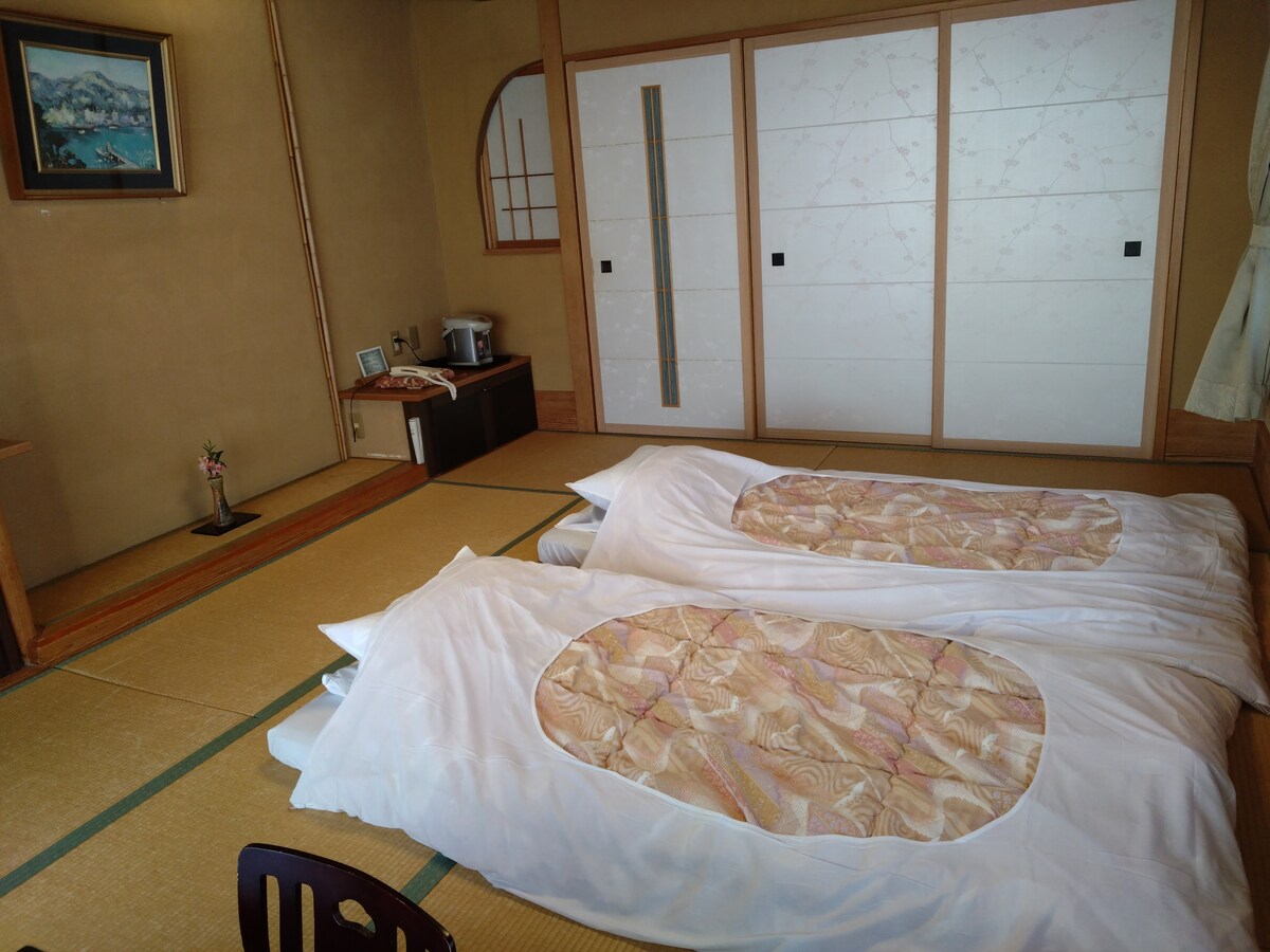 海景双人房,免费预约私人温泉,步行10分钟至公交站,步行20分钟至电车站,车程10分至大室山和海岸