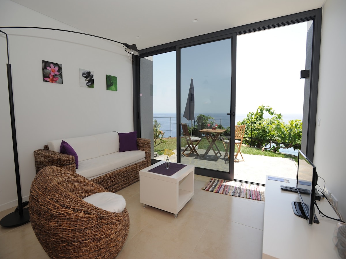 Modern studio in the sunny and serene coastal village of Jardim do Mar, south west of Madeira Island. Studio D features an open plan design with kitchenette, lounging area, TV (with Netflix), a cozy queen size bed, a spacious bathroom with washing machine and a private, south facing balcony with ocean and pool view (24° to 26° Celsius). Guests have full access to the garden and heated saltwater pool.