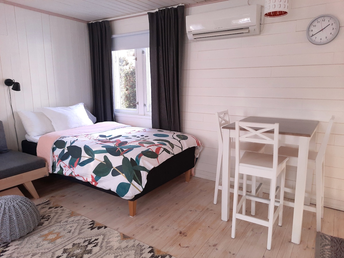Välkommen till vårt mysiga gästhus i rött trä med moderna bekvämligheter, en privat studiolägenhet i skandinavisk stil som är perfekt för 1–2 gäster. Denna 35 m² stora reträtt ligger i ett lugnt bostadsområde och en lummig grön gård och erbjuder moderna bekvämligheter, en dedikerad arbetsyta för distansarbete och fullständig lugn. Njut av din egen uteplats, egen ingång och gratis parkering på plats. En fridfull fristad för avkoppling eller produktivitet.