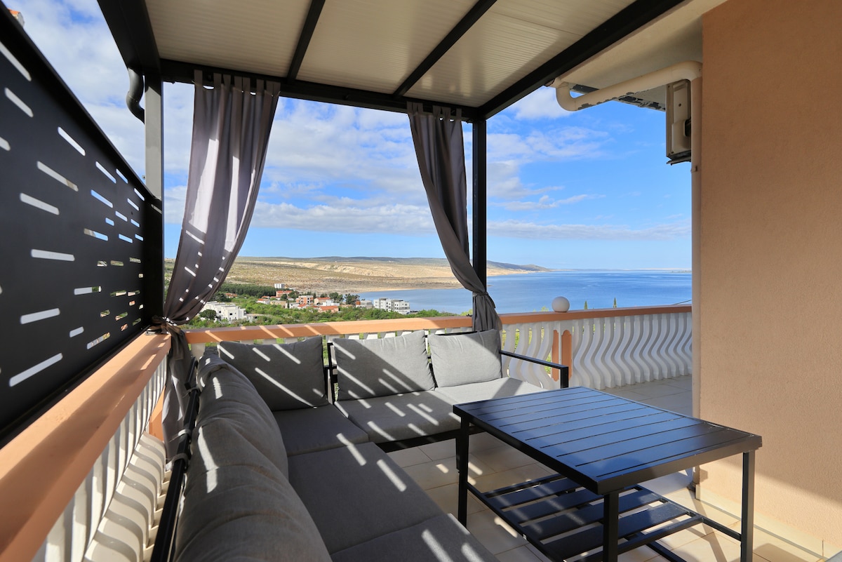 Våra lägenheter med fantastisk havsutsikt ligger i Rovanjska, en liten och lugn semesterort som ligger mellan bergskedjan Velebit och Adriatiska havet. Det erbjuder en unik inblick i Medelhavets kultur på grund av dess ovanliga kombination av vackra stränder på ena sidan och bergskedjor på andra sidan.<br>Nästa långa steniga strand ligger 450 m från huset.<br><br>Denna bekväma och vackra lägenhet rymmer 7 personer. Det är extremt ljust och luftigt.