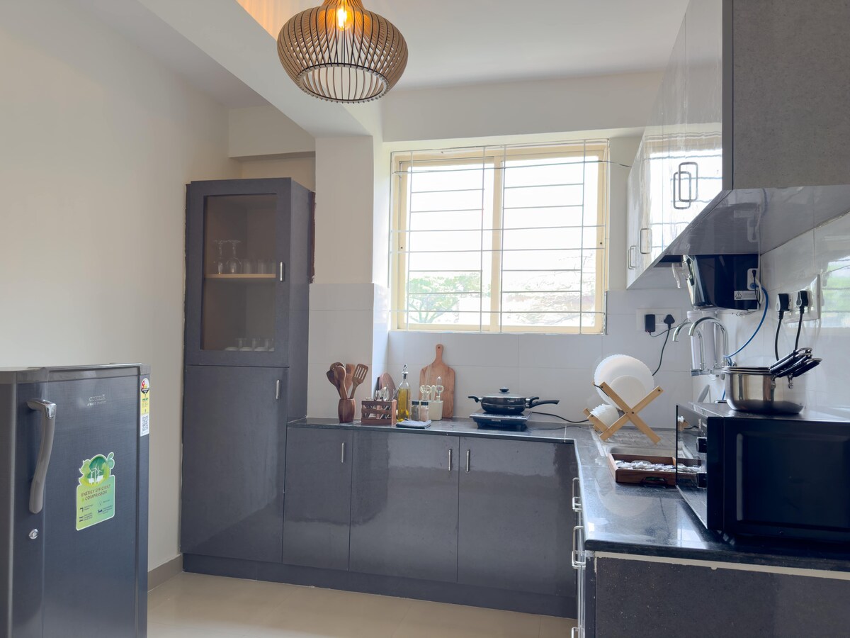 Välkommen till vår mysiga 2 BHK-lägenhet inbäddad i en lugn hotspot i Bangalore. Njut av lugnet i denna lugna reträtt, utrustad med en luftkonditionering (i ett sovrum) för komfort. Streama sömlöst med upp till 100 Mbps WiFi och parkera bekvämt din bil och cykel problemfritt. Njut av gratis te och kaffe när du kopplar av på premiummadrasser klädda i kvalitetssängkläder. Vi har dig täckt med medföljande schampo och kroppsgel för en bekymmersfri vistelse. Upplev komfort och bekvämlighet när den är som bäst!