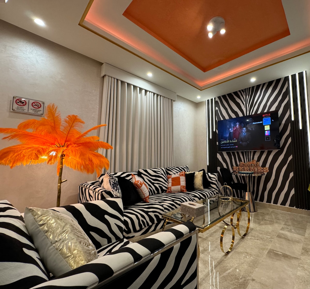 Välkommen till "FENDI", en lyxig svit mitt i hjärtat av Jeddah, perfekt för nygifta och familjer. Njut av elegant inredning, en TV i biografstil, massagejacuzzi, allmän pool, bastu och en underhållningslounge. Upplev oöverträffad komfort och sofistikering. Njut av fantastisk utsikt över staden och personliga tjänster, vilket gör varje ögonblick oförglömlig. Boka nu för att upptäcka FENDIs charm.