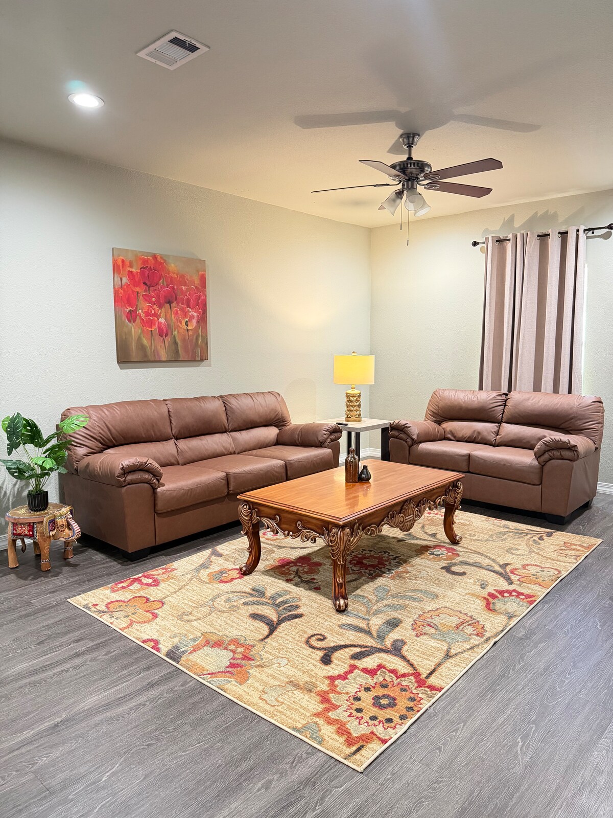 Detta vackra boende med 3 sovrum har 2 fulla badrum, ett rymligt garage för 2 bilar och rymmer upp till 8 gäster. Vardagsrummet har höga valvade tak som kompletteras med en mysig gasspis, medan den fridfulla uteplatsen på bakgården erbjuder en bekväm sektionssoffa, en gaseldstad, en grill och en stor TV. Perfekt för familjer och yrkesverksamma som söker ett bekvämare och rymligare alternativ till ett hotellrum, och bekvämt beläget bara några minuter från stora butiker, restauranger och sjukhus.