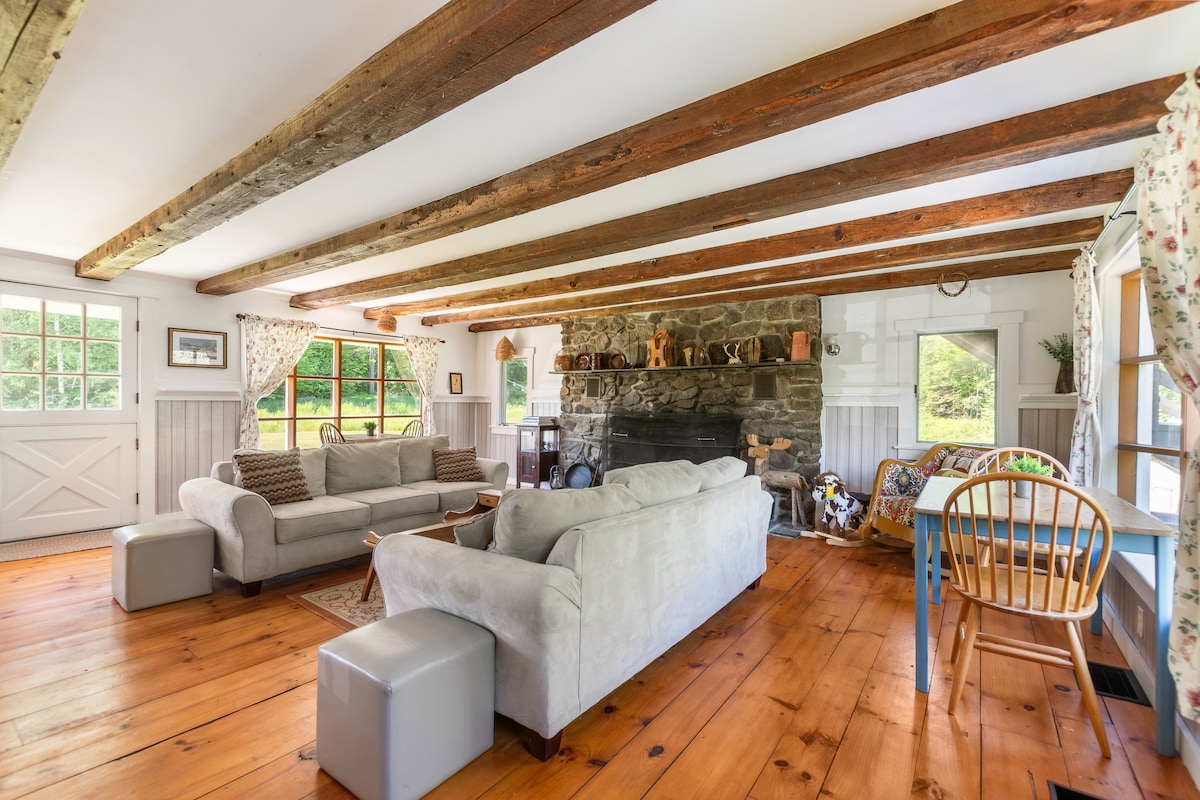 Immerse yourself in the quintessential Vermont experience at Storeybrook Farm. This rescue horse sanctuary is located amidst rolling hills, mountain vistas and a tranquil pond. "The Carriage House” is our largest suite with a fully equipped kitchen (stocked upon request), that opens up to a dining area with forest views. The living room features a woodburning fireplace and 2 built in queen bed "bunks". Enjoy sun-soaked pasture views from the main bedroom or while soaking in the clawfoot bathtub.