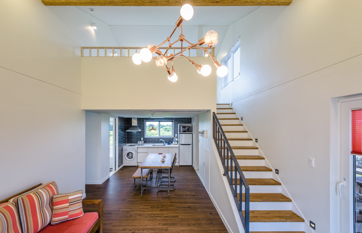Det är ett miljövänligt hus på landet, så lukten av trä är trevlig.Det är ett vackert och rymligt studiolokal i loftstil där familj och vänner kan koppla av tillsammans. Inte hela huset!! Du kan använda verandan separat~ Toalett, dusch och tvättrum är separerade, så tre personer kan använda den samtidigt. Bidet är grundläggande!! Vårt par njuter av parkgolf varje dag. Vi guidar dig också till parkens golfbana och spelar tillsammans. Njut av Andeok Valley och Gunsan Oreum Olle Route 9 till fots Om du går upp till Gunsan Oreum kan du se Jeju arbete i 4 minuter. Gapado Marado Songaksan Sanbangsan Yongmeori-kusten från Suwolbong Peak till Seogwipo ~ Berömda turistattraktioner som Jusangjeolli, Cheonjeyeon Falls, Jungmun Saekdal Beach, Hwasun Gold Sand Beach, Teddy Bear Museum, Osulloc, Gotjawal och Jungmun Tourist Complex ligger 10 minuter bort. Camellia Hill ligger 5 minuter bort ~ ^ ^ Songaksan 20 minuter Hallasan Yeongsil Entrance 1100 20 minuter Flygplats 40 min. Säkert boende med elektrisk spishäll och inte med gas!! Ett säkert boende med B&B-tillstånd!