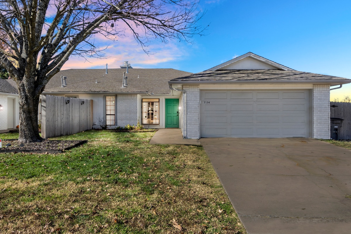 Fly till denna uppdaterade 3BR/2BA Mid-Town Tulsa retreat som erbjuder komfort och stil. Koppla av med lyxiga sängkläder, gratis snacks och en privat bakgård med täckt uteplats. Smart-TV i varje rum, inklusive 70" i vardagsrummet och 55" i matsalen. Minuter från shopping, parker, sjukhus och LaFortune Park & Golf. Enkel motorvägsåtkomst för sömlösa resor. Saneras professionellt efter varje vistelse för din sinnesro.