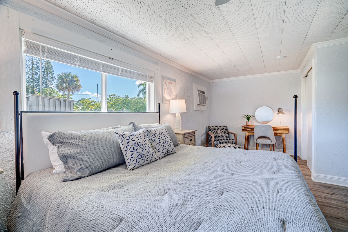 Vår studio renoverades nyligen och allt är nytt! Det är ett pittoreskt utrymme med bra inredning och ett stort anpassat kakelbadrum och dusch. King-sängen är supermysig och enheten är utrustad med allt du kan behöva, inklusive höghastighets-wifi, väggmonterad TV, AC-kontroll och ett fullt utrustat kök. Vi är gångavstånd/cykelavstånd till vattnet och allt som downtown Stuart har att erbjuda!
