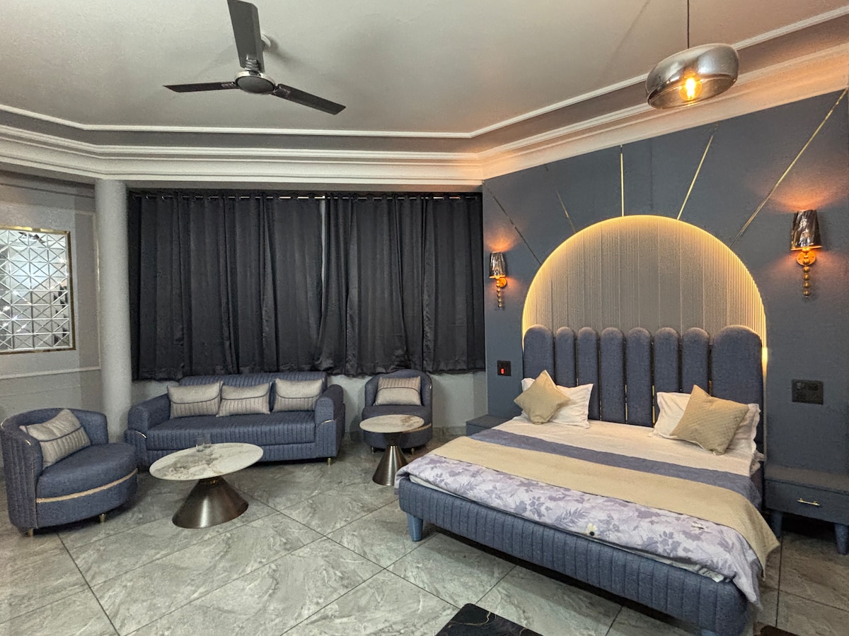 Relax in this spacious, stylish room featuring a plush king-size bed and a comfortable lounge seating area. Soft lighting and modern interiors create a calm, elegant atmosphere, while large windows offer peaceful farm and garden views. The open layout provides plenty of space to unwind, making it perfect for couples or small families seeking a quiet and refreshing stay close to nature.