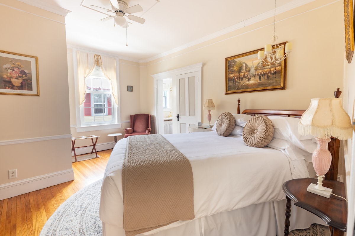 Welcome to the Painted Cat of Galena, a cozy Victorian B&B with feline flair! The Persian Room is pink, playful & the perfect place to experience Victorian glamor. Featuring a cozy sitting nook in the bay window, you'll find amazing views of the historic neighborhood. Also features an ensuite bathroom with a pink claw-foot tub. Includes a Roku HDTV, window AC, electric fireplace and steam heat. Daily breakfast included with your stay! Proudly welcoming cat lovers of all stripes 🏳️⚧️🏳️🌈