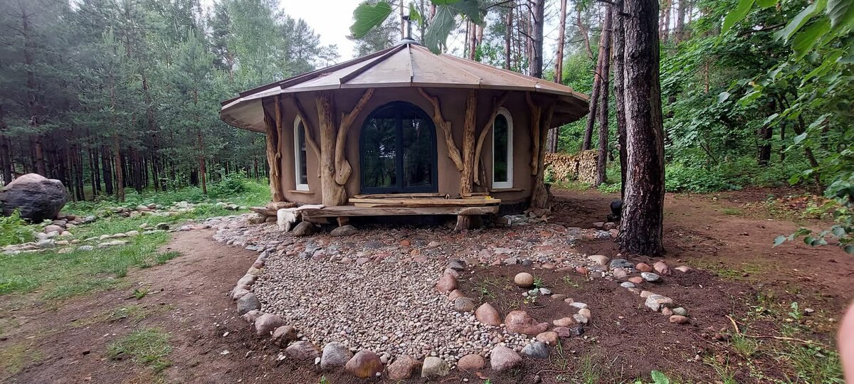 Magiskt hus av halm och lera mitt i skogen. Med vackert fönster på taket. När du ligger i sängen kan du titta på stjärnor. Och njuta av att vara nära öppen spis. Alla årstider är vackra att vara i naturen. Bara att veta att kök, toalett och duschplatser är separata från hemmet.