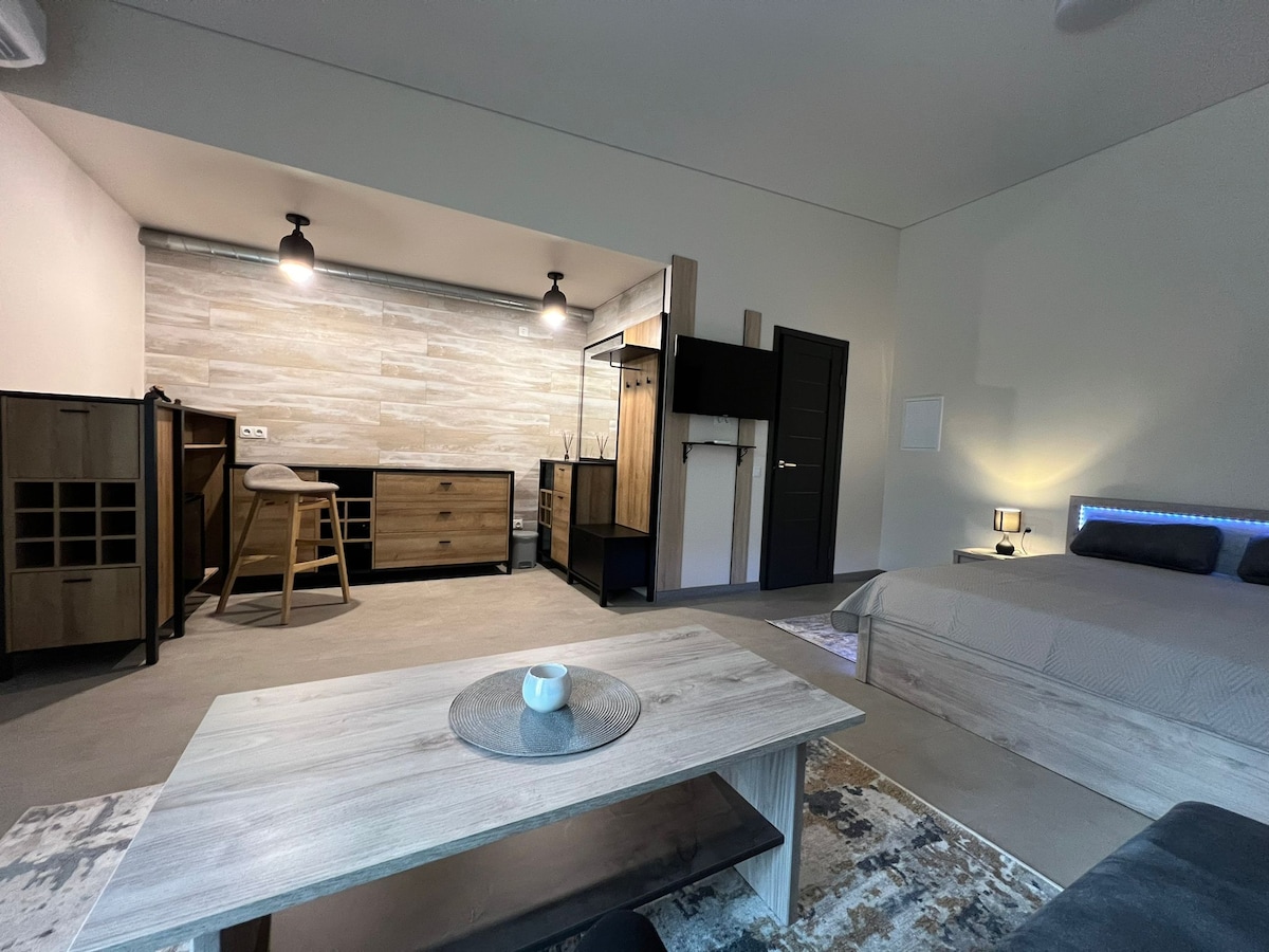 Det är en välutrustad lägenhetsstudio med en stor terrass där du kan njuta av morgonkaffe. Området är inhägnat, med en stor trädgård. Det finns toalett och dusch i huset. En dubbelsäng och en mjuk hörna med en sovdel, garderob för kläder. Stor TV, Netflix och Wi Fi. Eldstad. Utomhus tennisbanor och en pool är tillgängliga för en varm säsong. Köket är utrustat med induktionshäll, kylskåp och diskbänk. Här hittar du allt du behöver för en kort stund.