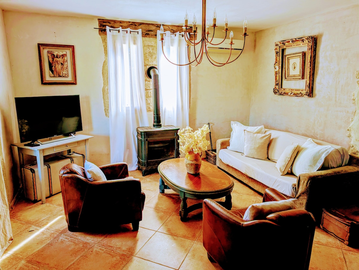 Ett renoverat hus som en del av "Château des Princes d'Orange" från 1700-talet. Med de ursprungliga funktionerna i slottet bevarade såsom öppen spis och snidade tak, består huset på 135 m² av ett vardagsrum, ett pentry, 3 sovrum, två badrum och en gästtoalett. Det finns en privat terrass med utsikt över parken och poolen. Ett idealiskt semesterhus för familjer med barn eller 6 vuxna.