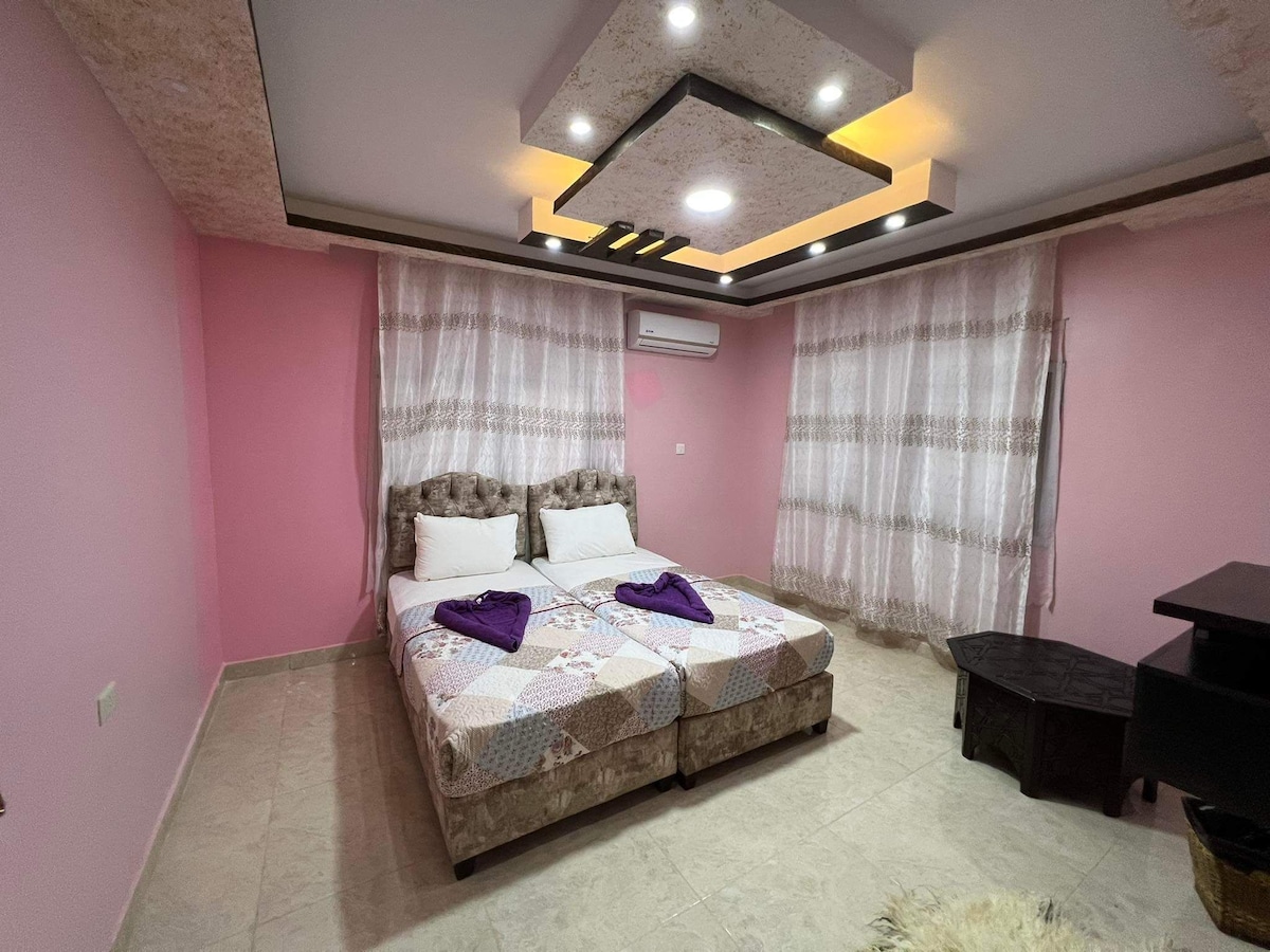 Koppla av med hela familjen i detta fridfulla, säkra och privata boende. Det är 13 minuter från Madaba stad. 30 minuter från flygplatsen. Det är 40 minuter från Amman. 38 minuter bort vid Döda havet. 27 minuter från Ma 'in Al-Sakhna bad. Det är 20 minuter från Mount Nebo. Lägenheten är 155 meter. Fullt utrustat kök. Skrivbord, Wi-Fi och 55-tums HD-TV. Två sovrum och ett badrum. Egen innergård och lugn utsikt. Bekvämt vardagsrum. Obs: Det finns en turguideförare med en modern bil för leverans till alla delar av Jordanien.