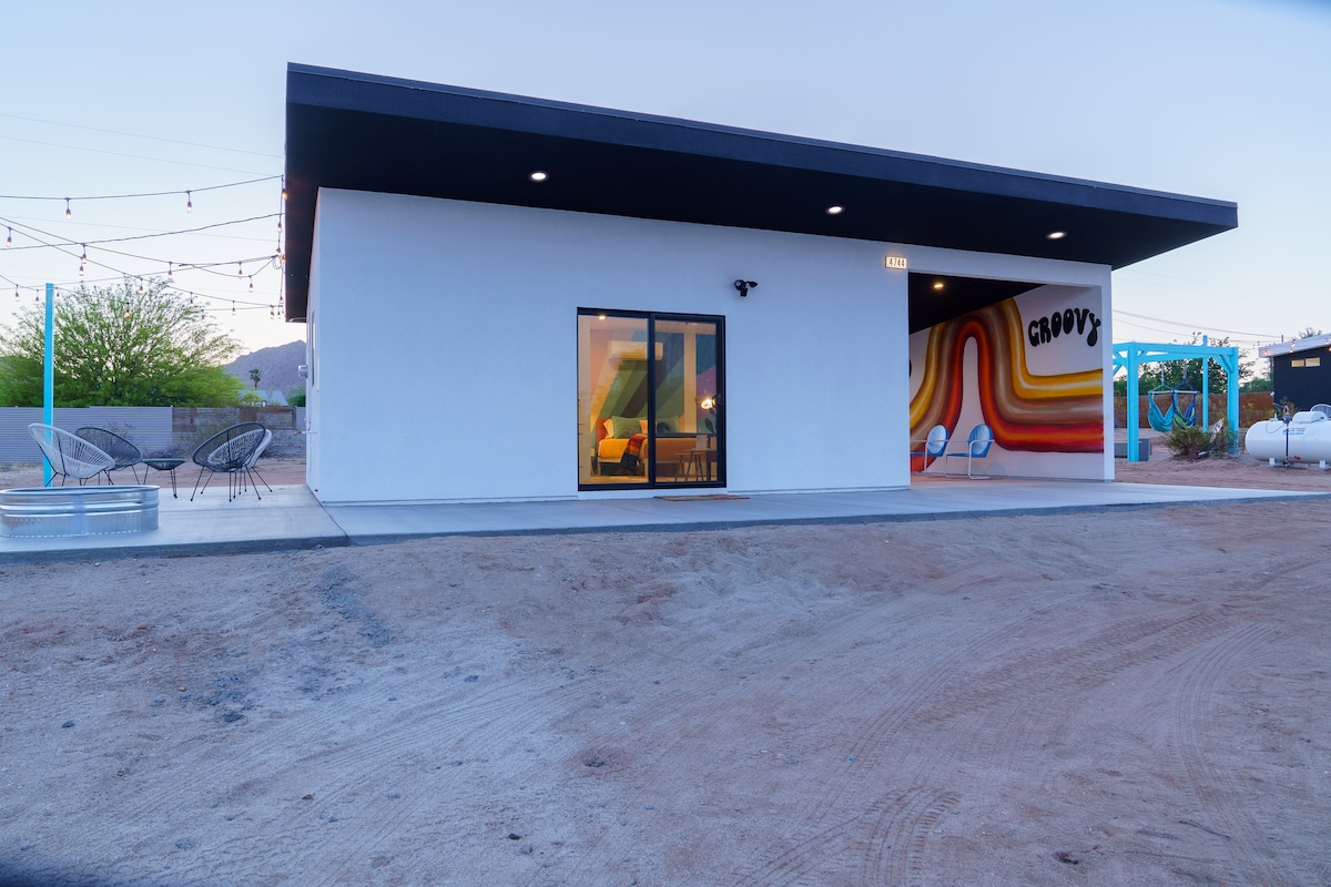 Cool off this summer + see the stars at The Luna Lookout, a 400 sq ft home reimagined as a Mid-century modern indoor / outdoor space. - walk out shower - 2nd outdoor shower - double tubs (cold or hot) - outdoor fire pit - fast wifi - projector to stream movies (bring laptop) - hanging swing chairs - gas outdoor grill - outdoor shower - hammocks - patio bed + chair - tower w/ loft for chillin' & star gazing - concrete floors - romantic Voted The Best Airbnb in Joshua Tree