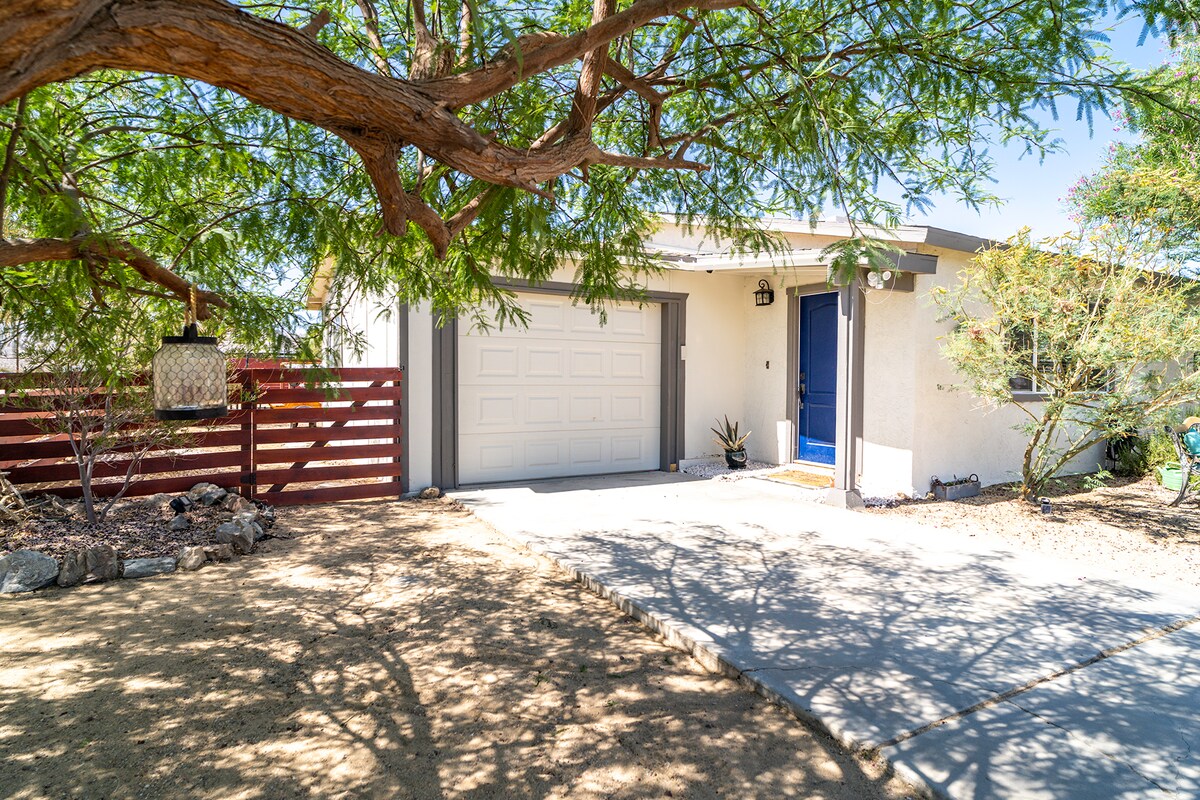 Koppla av på Beavertail, vårt konstnärliga gästhus på loftet i det eftertraktade Quail Springs-området i Joshua Tree omgivet av 5 tunnland inhemska kaktusar och 200+ Joshua-träd och djurliv. Super chill vibbar. Nytt kök. AC. Yoga uteplats. Härligt äventyr, mysig romantisk semester, wellness retreat eller avlägset arbetsplats. Nära vandring och Joshua Tree National Park. 5 minuters bilresa till barer och restauranger. Nivå 2 laddning av elbil, snabbt internet, Instacart. Finns i California Lifestyle Magazine.