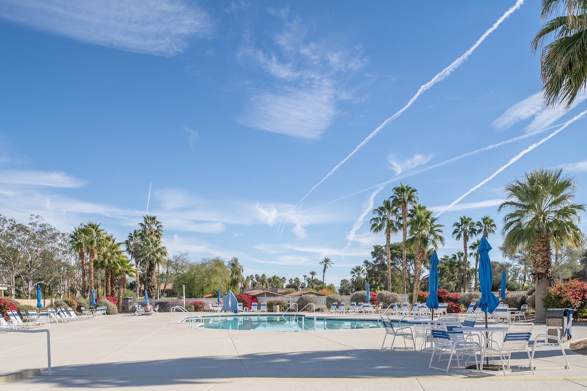 Mysig studiolägenhet med egen ingång och uteplats, pool och spa, golf runt omkring, 8 min — Tennis Gardens, 12 min — Acrisure, win win läge! I hjärtat av en stad, men i ett lugnt grannskap med massor av gatuparkering. 10 minuters promenad: Albertson's, TraderJoe's, bensinstation, kemtvätt, hår- och nagelsalonger och några restauranger. Snabb bilresa: Exklusiva butiker, konstgallerier, restauranger och barer på El Paseo, Acresure Arena, McCollum Theater, Tennis Gardens, Golf, Chella, Stagecoach, Living Desert Zoo, Casino