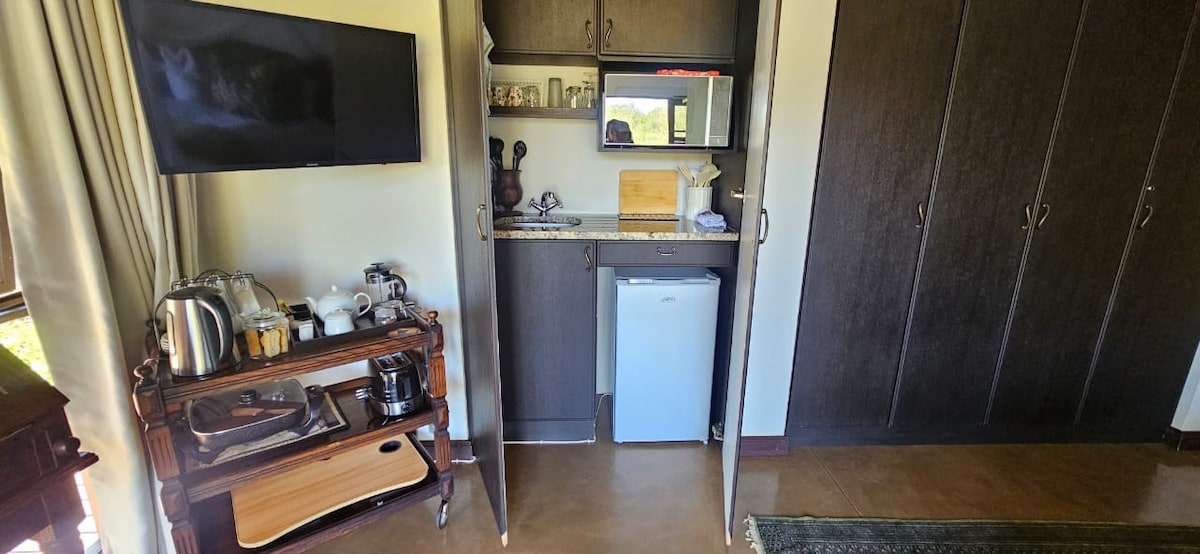 Belvedere Cottage ligger på Belvedere Game Ranch, ett privat viltreservat. Stugan ligger bredvid bondgården med en privat utsikt över den naturliga bushvelden. Lägenheten har ett separat dubbelrum och en bäddsoffa i vardagsrummet där 2 barn kan sova gratis. Litet kök med kylskåp, gasplatta, mikrovågsugn, vattenkokare, brödrost, porslin och bestick. Det finns också privata grillmöjligheter. Ingen belastningsavskiljning. Detta är ett perfekt stopp på vägen till Moçambique, Kosi Bay eller Sodwana.