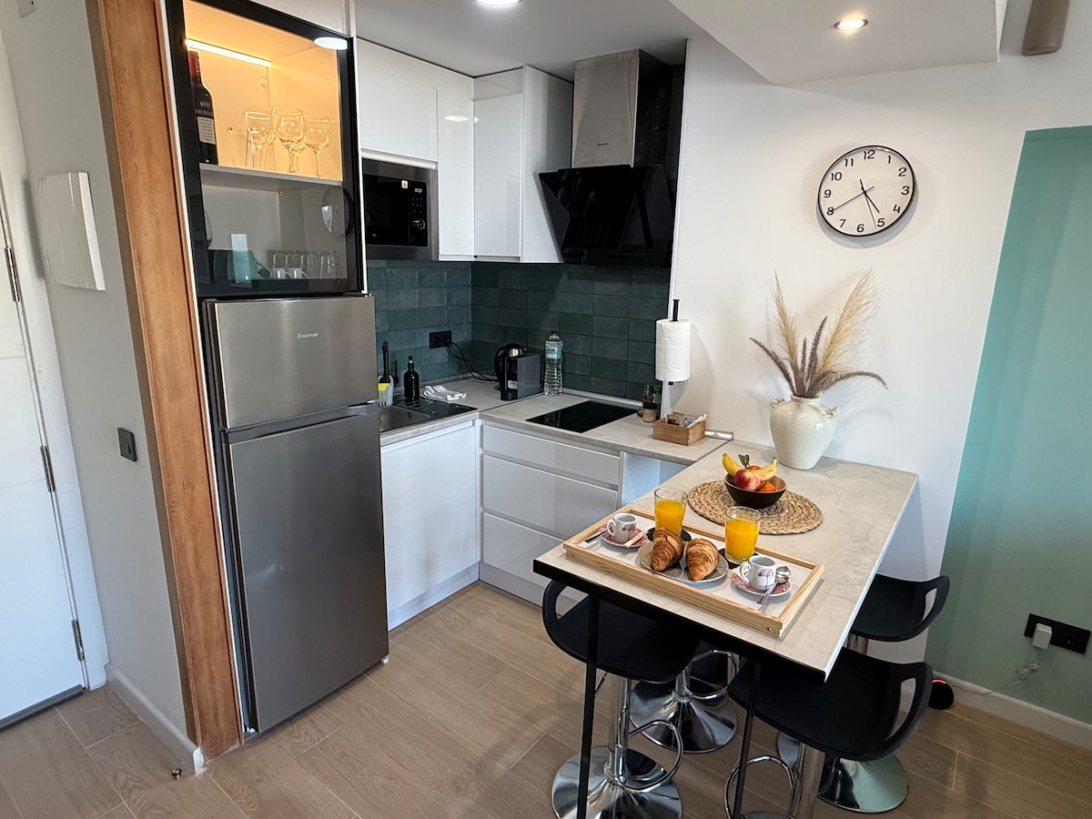 Nyrenoverad enrumslägenhet med en queen size-säng, luftkonditionering och 600 MB internetuppkoppling. Beläget på tredje våningen i en byggnad med 3 hissar. Poolen är öppen från juni till september. Vacker utsikt över hav och berg. Fullt utrustat kök med diskmaskin, mikrovågsugn, Nespresso-kaffebryggare, vattenpanna, brödrost och alla redskap som behövs för att laga mat. Du hittar strykjärn och hårtork, wifi (optisk fiber med 600 MB hastighet) och Smart TV med Movistar-kanaler.