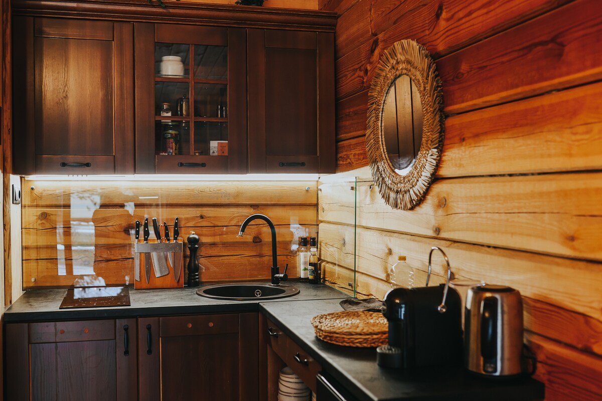 Tikai 25 min attālumā no Vecrīgas pieejama rāma atpūta ārpus pilsētas rāmjiem. Meža ieskautajā namiņā būs iespēja paslēpties no ikdienas steigas, klausoties meža un putnu skaņās, relaksējoties vannā ar skatu uz dabu, skatoties zvaigznēs no baļļas, baudot nesteidzīgas brokastis uz plašās terases vai lasot grāmatu guļamtīklā. Apartamentos pieejams arī grils, pilnībā aprīkota virtuve, ugunskura vieta uz terases, kamīns un siltumsūknis komforta cienītājiem. Lielupes peldvieta 800m. Jūrmala 10 km.