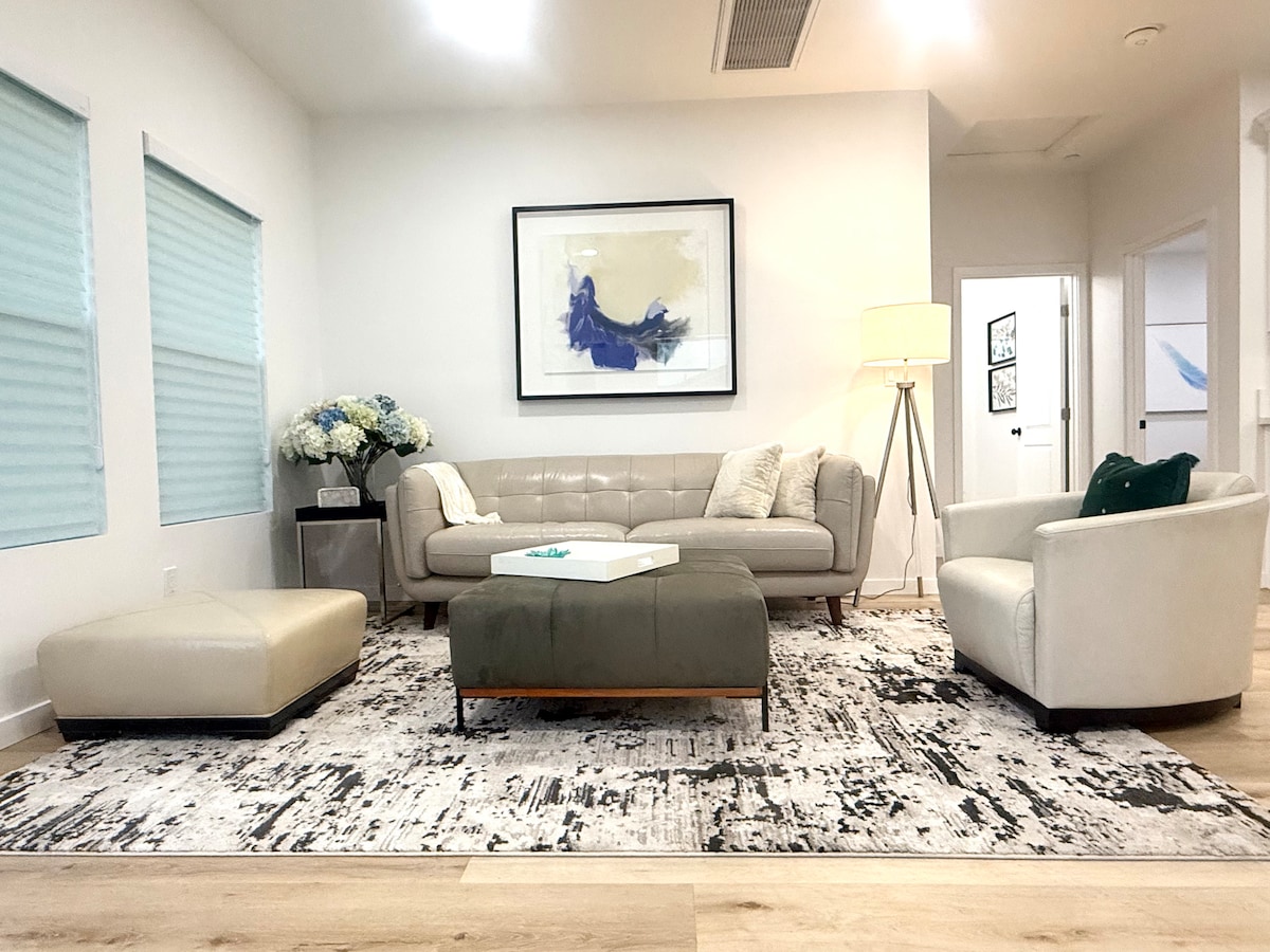 Underbart 3 sängar/2 badrum envåningshus med PRIVAT POOL som känns som en 5-stjärnig resort med GRATIS ELBIL laddning för din bil. Vacker bakgård, grill och 12-sits lounge, pool och bubbelpool med vattenrutschkana. Eldstad, 85" LED-TV, arbetsyta, Wi-Fi med hög hastighet, löpband. Fullt utrustat kök, 6-brännare gasspis, risspis, kaffebryggare etc. Tvättstuga med tvättmaskin/torktumlare, strykjärn/strykbräda, luftkonditionering, värme, sängkläder/handdukar, Pack & play. Digitalt dörrlås, Uppfart för 4 fordon.