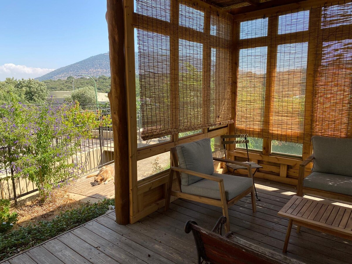 *För alla som är intresserade av att bo här under denna unika period av kriget med Iran … Huset har ett säkert rum, och antalet sirener här är noll.* Om du är ute efter en lugn semester, vara nära naturen och ta ett dopp i utsikten är detta det perfekta stället för dig. Välkommen. Huset är kysst och smälter in i Beit Keshet-skogen. Här kan ni umgås, laga mat åt er och göra saker ni älskar, koppla av på träbalkongen, njuta av lugnet och ljuden från skogen, ta ett dopp i poolen under de varma dagarna, värma er framför eldstaden och tillbringa tid i bastun under de kalla dagarna. * *Observera att huset ligger i ett bostadsområde som upprätthåller tystnad och natur, det är ett viktigt värde för boende. * *