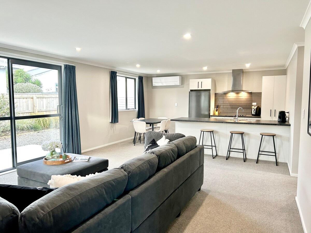 Smakfullt inrett bekvämt 1 sovrum helt fristående pensionat separat från familjehemmet. Öppen planlösning kök och vardagsrum, med ett urval av spel/pussel och böcker tillgängliga för din njutning. Huvudsovrum med king size-säng, barnsäng tillgänglig om så önskas. Ecosa bäddsoffa i loungen fälls ut till en bekväm queen-säng. Kontinental frukost tillhandahålls för att njuta med ditt morgon Nespresso-kaffe. Nära idrottsplatser, stormarknader och staden.