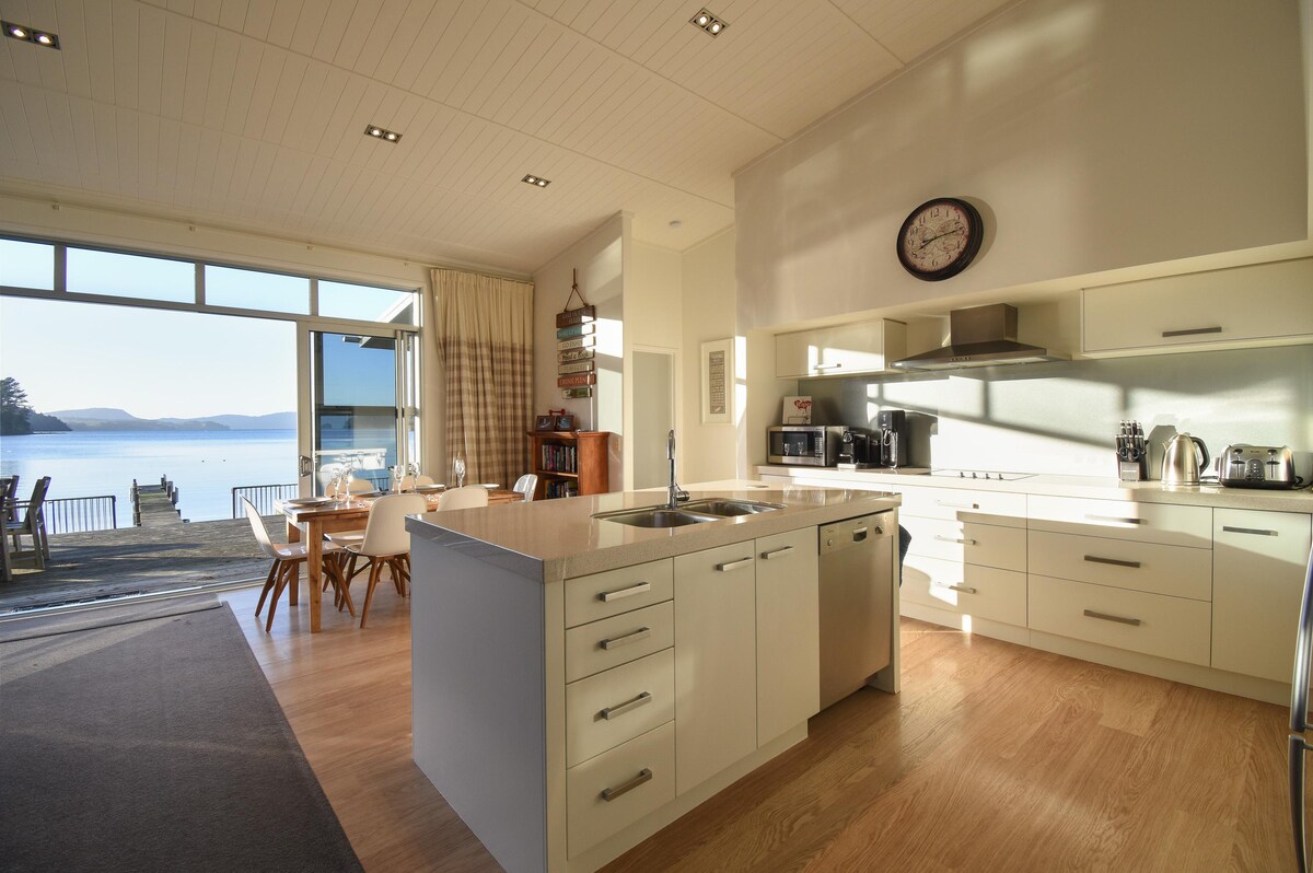 Du kommer inte vilja lämna detta charmiga, unika ställe. Precis i utkanten av den vackra sjön Rotoiti. Koppla av till ljudet av de sköljande vågorna och inhemska fågelsång. Bifold-dörrar öppnas på ditt privata däck precis vid vattenkanten. Parkera din båt/vattenskoter på bryggan redo för ditt nästa äventyr OCH du kan till och med ta med ditt pälsbarn med dig. Utomhusbadet är "rustikt" Enastående buskpromenader, vattenfall, varma pooler, glödmaskar och bara 20 minuter från Rotorua. Vi diskar!