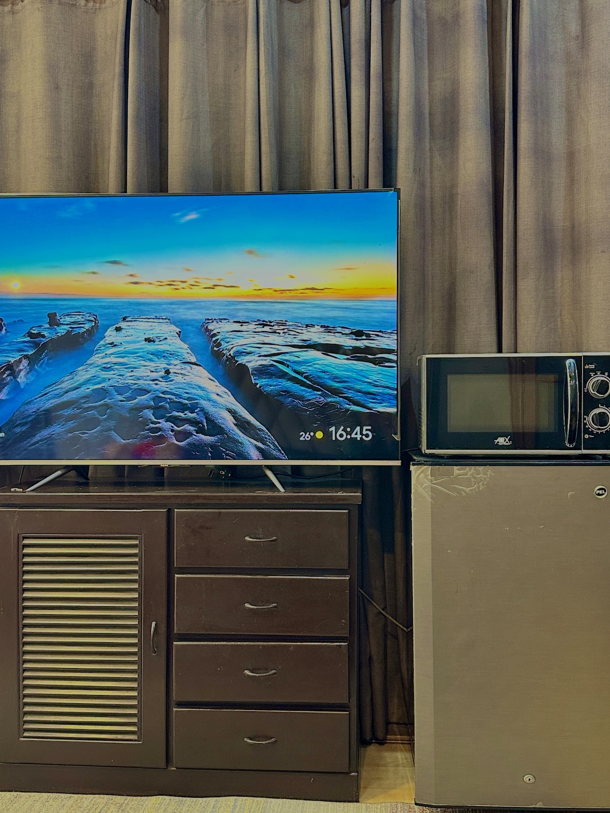 ●Kick back and relax in this calm, stylish space. ●Enjoy your getaway in a home away from home in this cozy and private studio apartment which is well suited for couples and family. ●It is very stylishly furnished with contemporary furniture and huge 55 inch TV for satisfying all your theatre cravings. ●Mini kitchen provides access to a quick snack, a cold drink and popcorns. Fitted with a huge AC, relax in this chilled spot to relieve your stress and get that resort like feel. Happy Stay!