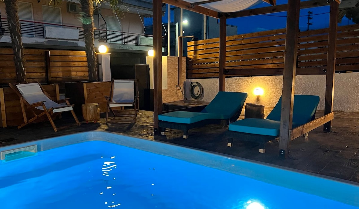 Villa Athena ligger 120 m från en fantastisk strand och bara 350 m från centrala Nea Kallikratia. Lägenheten på 1:a våningen har 2 sovrum och ett vardagsrum med 2 soffor som enkelt kan omvandlas till dubbelsängar. I badrummet finns en stående bubbelpool. 55-tums TV i vardagsrummet och en 32-tums TV i sovrummen, alla smartv & NETFLIX. Det underbara utomhusområdet samt poolen används endast av hyresgästerna i de 2 lägenheterna i Villa.