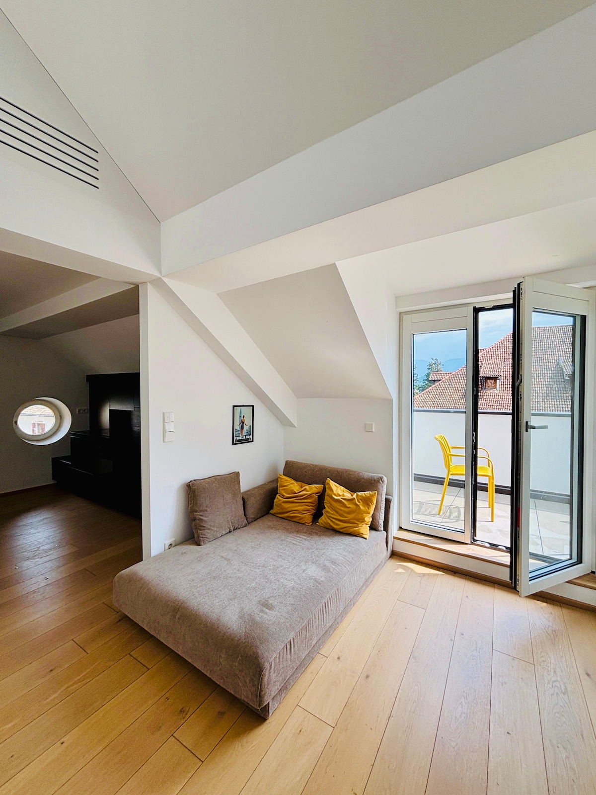 Elegant vindslägenhet på två plan mitt i Kaltern, på den berömda Goldgasse, med en ny balkong och härlig utsikt över den historiska stadskärnan. Här finns ett sovrum med en dubbelsäng, ett öppet vardagsrum med imponerande takhöjd, kokvrå, matbord och en bekväm soffa. Höjdpunkterna inkluderar en regndusch, fiberoptiskt internet, luftkonditionering, gratis parkering i närheten, förvaring för skidor eller cyklar och Südtirol Guest Pass.