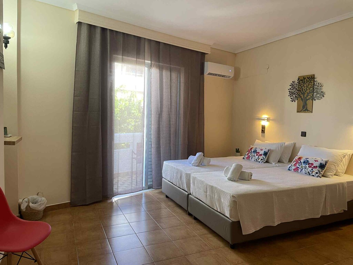 Fastigheten för ligger i vår 2000 m2 olivlund som ligger i den frodiga och fridfulla bostadsförstaden "Iraklis” (Hercules) 1,5 km från stadens centrum och 800 m från havet. Stugan har egen ingång, kök och toalett och ligger 20 meter från "Atelie in the Olive Grove",
