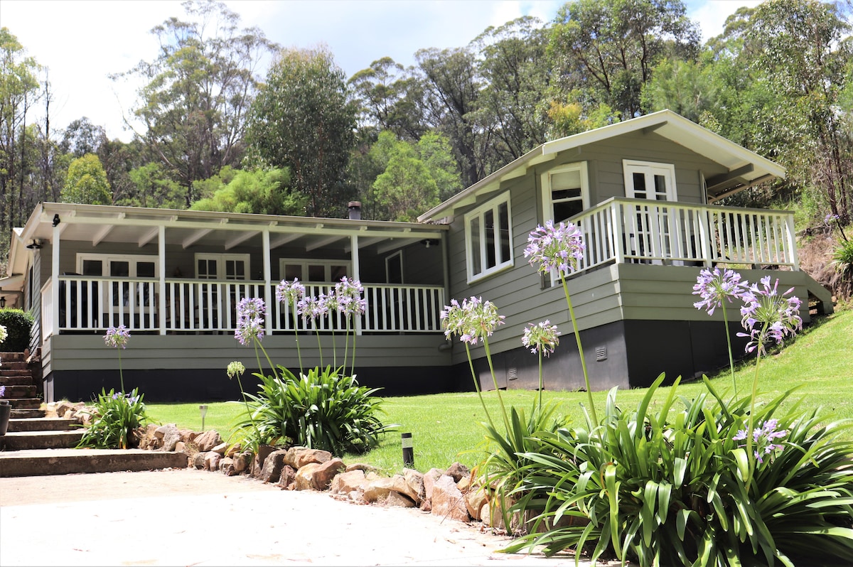 Välkommen till Maya Sanctuary:) The Artist 's Lodge är en underbar 2 våningar stuga med utsikt över Blackheath Creek, mitt i en vacker 200 tunnland stor tillflyktsort i Blue Mountains. Det byggdes med handgjorda lertegel och återvunnet trä från Old Woolloomooloo Wharf i Sydney, och med en vedspis och en privat bubbelpool utomhus är det det perfekta stället för att vila och komma till sig igen.