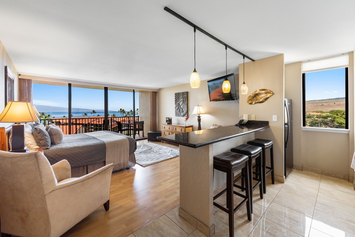 Oceanview studio på översta våningen i Royal Kahana Resort, erbjuder svepande utsikt över Stilla havet och romantiska solnedgångar för avkoppling. Denna luftkonditionerade lägenhet har en bekväm king size-säng, fullt utrustat kök, Smart-TV, snabbt Wi-Fi och den extra bekvämligheten med en tvättmaskin och torktumlare i lägenheten – perfekt för längre vistelser eller packning av ljus. Boendet vid havet har en pool vid havet, grillplats och utomhusdusch och ligger centralt på västra Maui nära restauranger, stränder och snorkling.