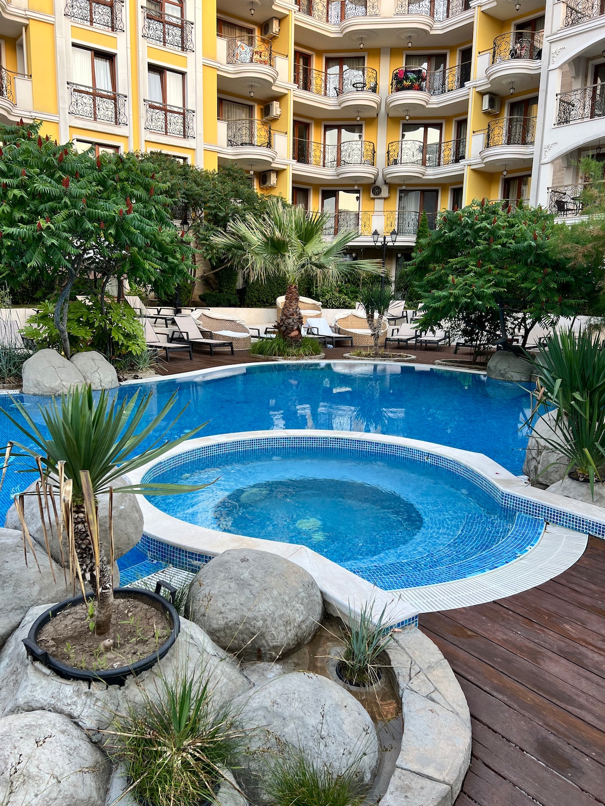 Inom gångavstånd finns stormarknaden LIDL, vattenparken Action, restaurangen Djanny, 4 minuters bilresa till den berömda nattklubben Cacao Beach, avståndet till flygplatsen i Burgas är 27 km. Avståndet till gamla stan Nesebar är 6 km. Spa och inomhuspool med uppvärmning året runt på området, restaurang med levande musik.