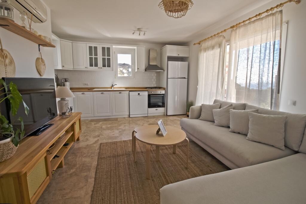 Denna rymliga villa ligger inbäddad i naturen och omgiven av fågelsång och har en stor privat trädgård, fantastisk utsikt och alla bekvämligheter som ett hem ska ha – perfekt för en riktigt avkopplande vistelse. Perfekt för familjer, par eller distansarbetare som söker lugn utan att kompromissa med komfort eller läge. Bara 5 minuters bilresa till närmaste strand. Spektakulär utsikt över Gümüşlük och närliggande turkiska och grekiska öar Expansiv trädgård: sola, öva yoga, eller helt enkelt njuta av naturens lugn