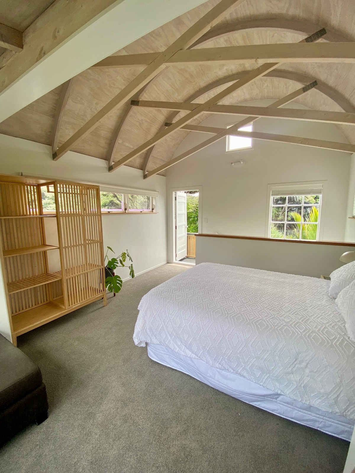 Vakna upp omgiven av inhemsk buske, en fridfull dal vid foten av de skyddade Waitākere Ranges. Från din bekväma säng kan du njuta av utsikten genom vackert utformade fönster med träramar och se landskapet långsamt vakna till liv. Lyssna på inhemska fåglar som ropar genom skogen medan mjukt morgonljus filtreras genom träden. Oavsett om du dricker kaffe på däcket eller helt enkelt njuter av lugnet, bjuder Dreamlands Cottage in dig att sakta ner och fly från vardagens stress
