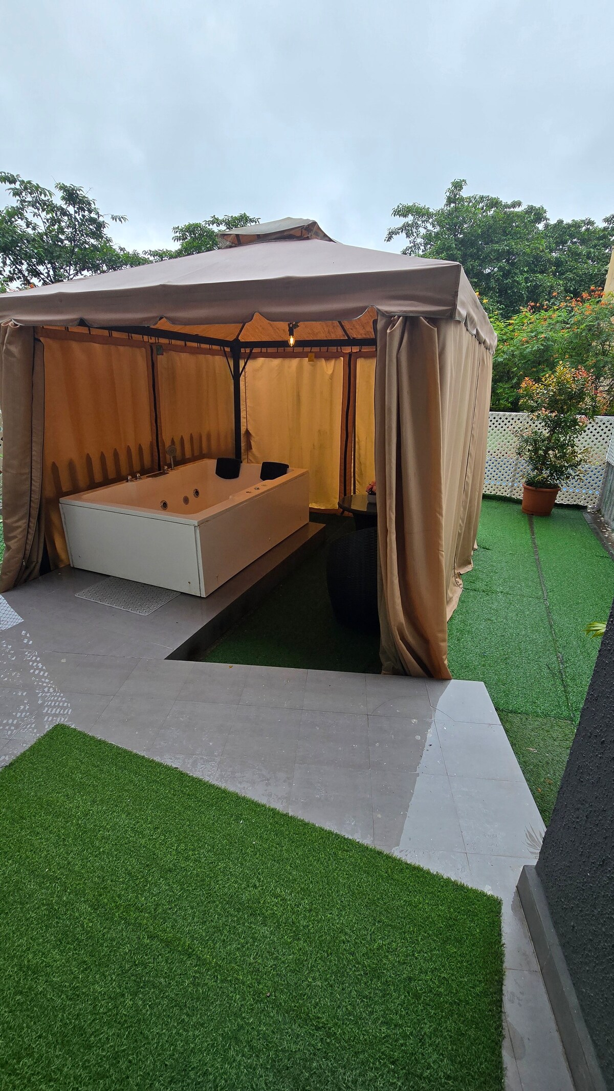 Boho Style Luxury Studio with Jacuzzi and Garden. A peaceful getaway. Fully loaded with WiFi, JBL 2.1 Home Theatre, BT Music System, Full-HD LED TV. A stylish bathroom with toiletries. Pantry with tea/coffee supplies, RO water, Microwave, Induction Hob, Fridge & s/w Toaster. Fenced garden for children. Dine in the garden with beautiful weather. Jacuzzi has hot water that can be used anytime. Common amenities on-site like swimming pool, games room, gym, mini theatre, cycling and restaurant.