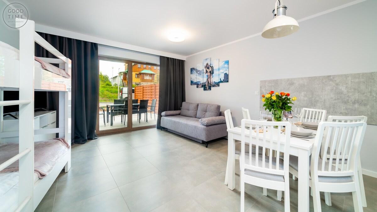 Välkommen till vår lägenhet"The Terrace" i Karpacz. Lägenheten ligger på bottenvåningen och kan nås från utsidan via en halv trappa eller via trapphuset direkt från garaget. Det har: - Sovrum med två enkelsängar TV - Vardagsrum/ matplats med utdragbar soffa, stor smartTV, öppet kök med matbord - Badrum med stor duschkabin - Stor altan (ca. 100 m2) -Flur med garderob och inbyggd garderob - Parkeringsplats i underjordisk parkering nr. 5